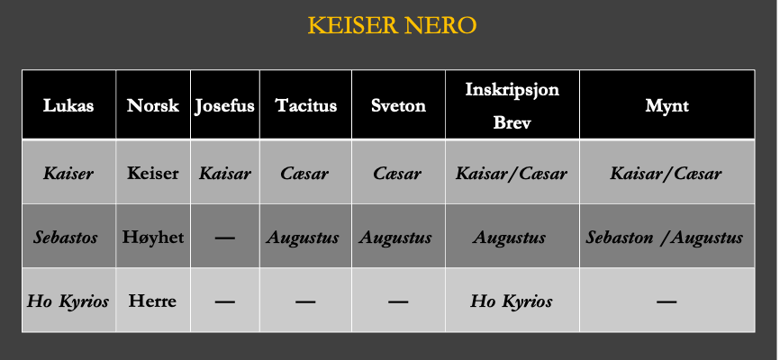 Lukas’ omtale av Nero i Apostlenes gjerninger kapittel 25 viser en bevisst bruk av samtidige keisertitler. Han gjengir landshøvding Festus’ utsagn med Kaisar, Sebastos (Høyhet) og Ho Kyrios (Herre), titler som også finnes i ikke-bibelske kilder (se Tabell 3). Kaisar var den vanligste betegnelsen i områdene der Det nye testamente utspiller seg, mens Sebastos (Høyhet) hadde en mer formell og offisiell klang. Bruken av Ho Kyrios (Herre) reflekterer den språklige utviklingen fra Neros tid, hvor keiseren i økende grad ble omtalt som Herre.